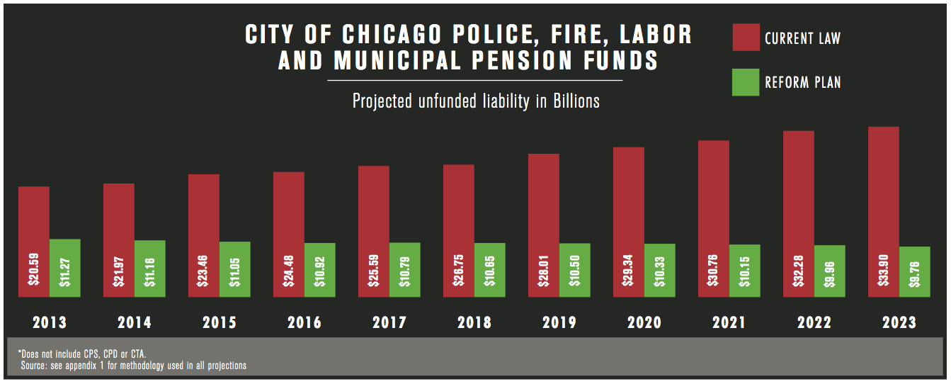 In contrast, despite massive increases in contributions, the city’s $20 billion in unfunded liabilities jumps by 65 percent over the next decade under current law.