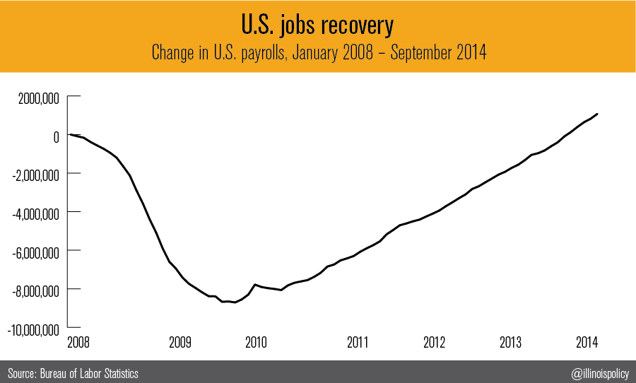 Illinois’ recovery has been dramatically slower than the national recovery, which itself has been unimpressive. Even though a record number of Americans are now out of the workforce, the U.S. recovery has left Illinois in the rearview mirror.