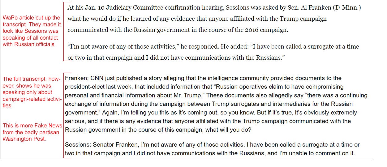 What happened here is the Washington Post, in reporting this, knowingly tried to make it look like Sessions was asked about contact with the ambassador during the campaign and lied about it, when in fact Sessions was asked about this as a member of the Foreign Service committee. That’s the terms in which he met the ambassador, both times were in his role as a senator on the Armed Services Committee, not as a member of the Trump campaign.