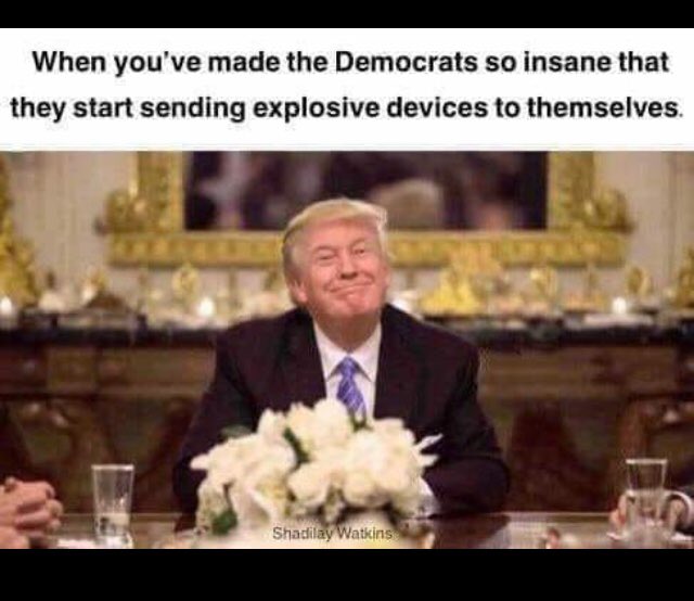 And of course that means Democrats. So here… By the way, the bomb that was sent to Clintons and Obama never got to their homes, just FYI. We still condemn them; don’t misunderstand. The bombs were intercepted by the postal service at one of the distribution centers, so they were discovered very quickly. The bomb that was sent to CNN didn’t even get sent to the right place in terms of where people work at CNN, and it was addressed to John Brennan, who doesn’t even work at CNN. He’s over at MSNBC.