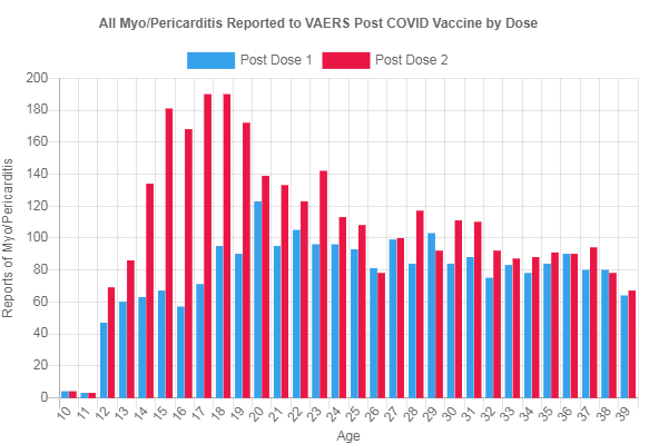 It’s not acceptable (and never was) for the media and the pharma-paid “fact checkers” to automatically dismiss VAERS. It is our main pharmaco-surveillance tool and was put in place precisely to serve as the consolation to the public for Congress absolving vaccine manufactures of liability. Also, the data complements what we’ve learned universally from all the myocarditis vaccine studies – that it targets teens and early 20s more than other age groups and is more potent after the second dose. Here is the age breakdown of the VAERS reporting: