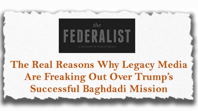 RUSH: Mollie Hemingway at The Federalist has a piece, “The Real Reasons Why [Drive-By] Media Are Freaking Out Over Trump’s Successful … Mission” to Wipe Out Al-Baghdadi Sahib Skyhook. Here are the three reasons: “1) Positive News Coverage Hurts Media Efforts to Destroy Trump. 2) ISIS Founder’s Death Complicates Media’s Syria Narrative.” Boy, does it. That narrative is Trump’s a buffoon. He’s incompetent. He’s an idiot, doesn’t know what he’s doing. He’s endangering everybody. Pulling troops out? What the hell!
